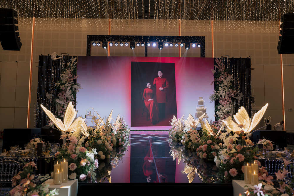 Một trong những bước tiến lớn nhất là việc sử dụng công nghệ trình chiếu Mapping trực tiếp lên các mảng rèm lụa (floor-to-ceiling drapes) hoặc tường hoa trắng. Bề mặt vải mềm mại giúp tán xạ ánh sáng, khiến những hình ảnh kỹ thuật số như cánh hoa rơi, mặt nước dập dềnh hay những thước phim kỷ niệm trở nên chân thực và đậm chất điện ảnh hơn.
