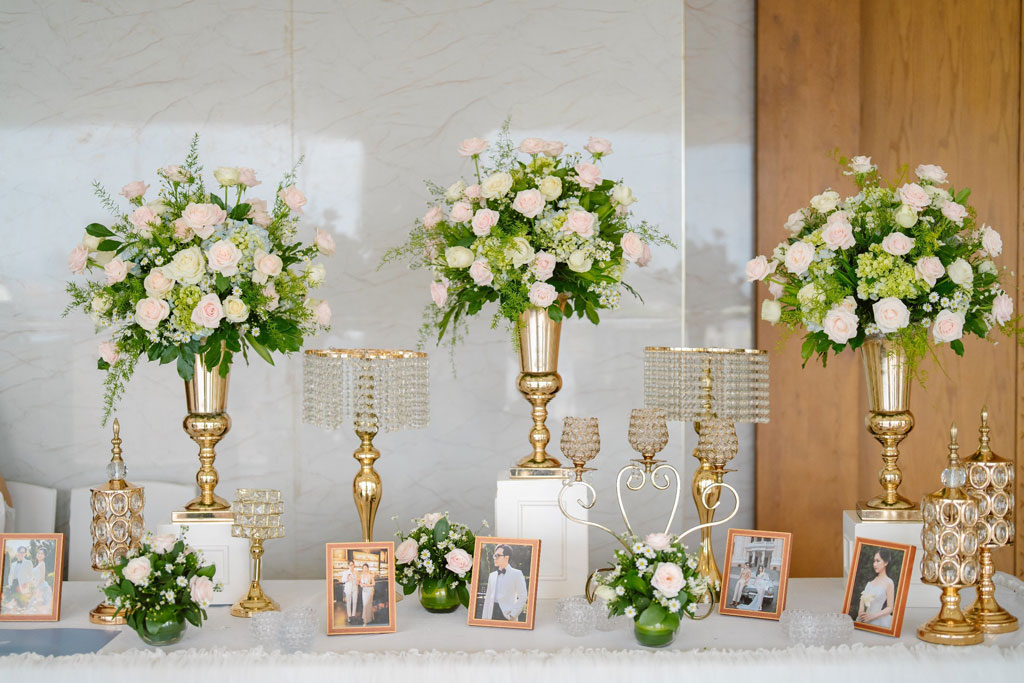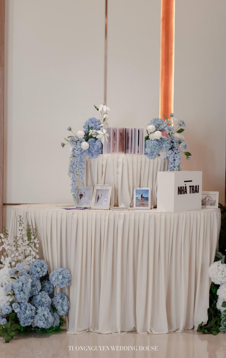 Không chỉ đơn thuần là nơi đón tiếp và ghi dấu ấn đầu tiên với khách mời, bàn gallery còn là khu vực thể hiện gu thẩm mỹ tinh tế của cô dâu – chú rể thông qua các chi tiết trang trí được lựa chọn kỹ lưỡng. Những bình hoa tươi sang trọng, hoa khô nghệ thuật, khung ảnh kỷ niệm, ánh nến lung linh, cùng thùng tiền mừng và sổ ký tên tinh xảo được sắp đặt khéo léo, mang đến cảm giác ấm áp, thanh lịch và đầy tính cá nhân hóa.